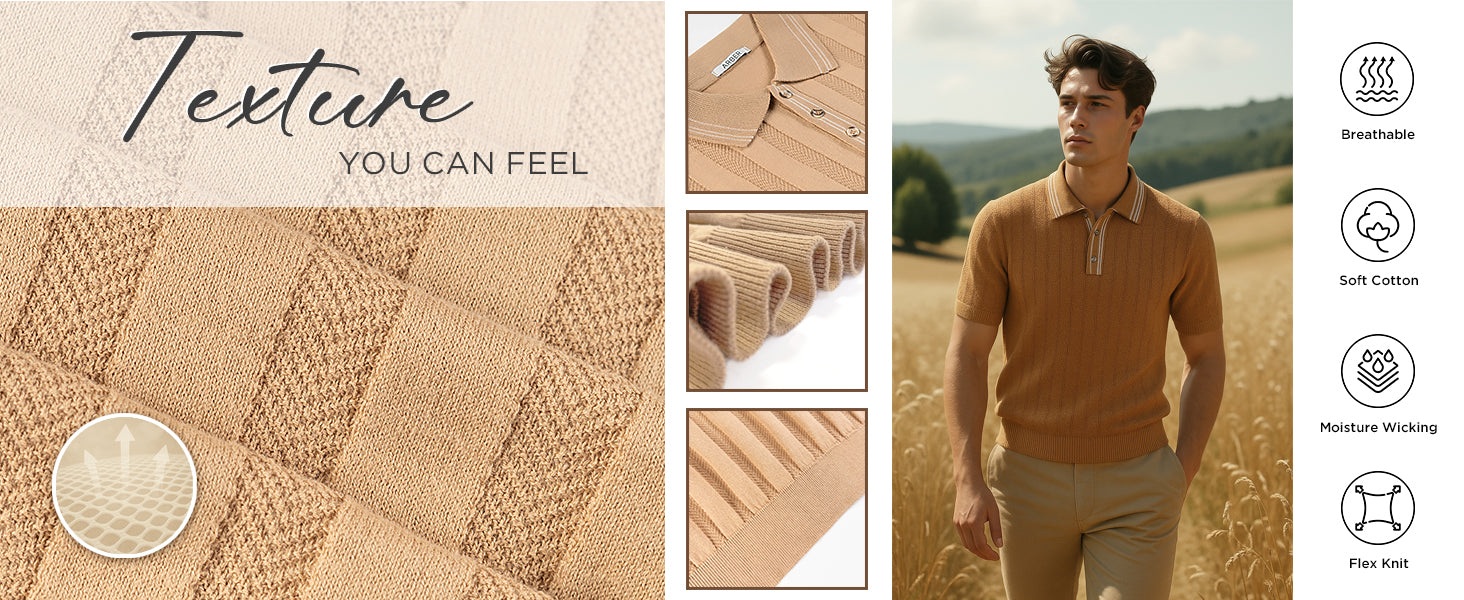 Arber Men's Textured Knit 100% Cotton Polo, Breathable Lightweight Short Sleeve Button Collar; Beige, Black, Blue, Navy